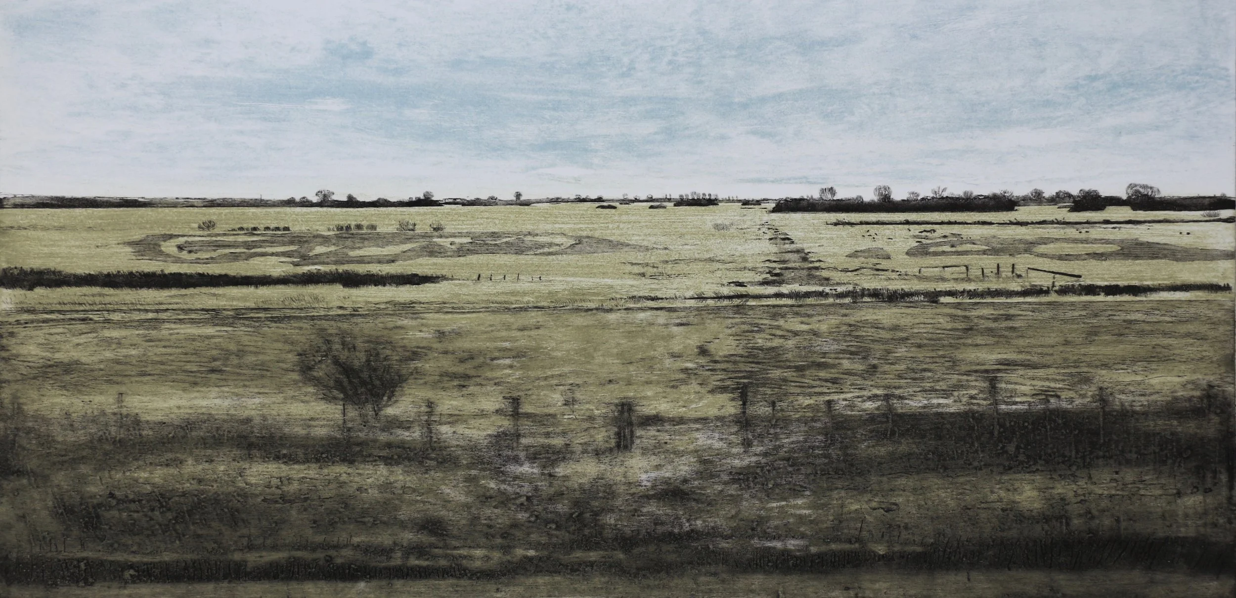 I have lived on the Fen Edge near Cambridge for the last twenty years and the focus of my work is the meeting point of land, horizon and sky, their flatness altering the perception of distance. My prints have gradually evolved from monochromatic studies by introducing colour to reflect the Fens’ ever-changing mood and light.